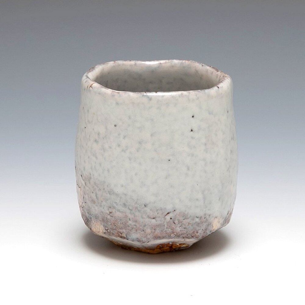 荒い土肌が白い釉薬から垣間見える筒形のぐい呑です。 松浦 無元 作 口径6.2㎝ 高さ7㎝ 木箱包装