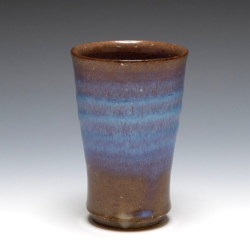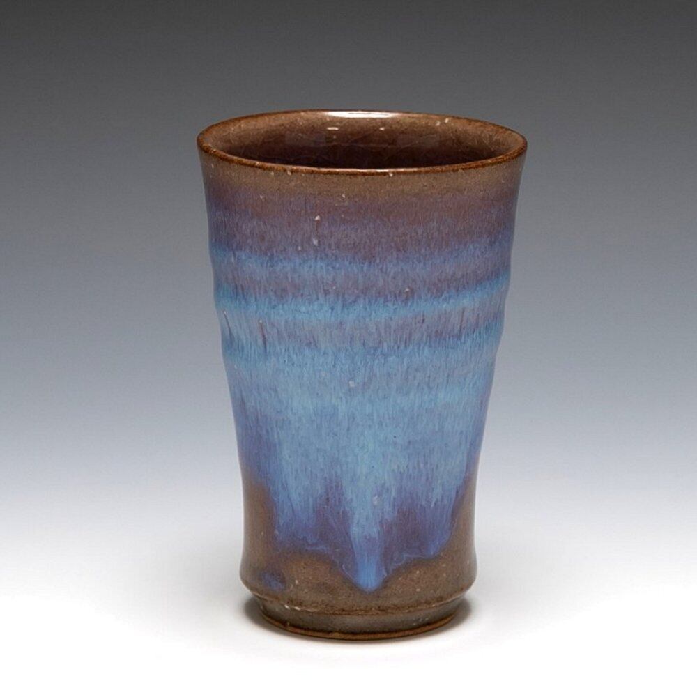 強い炎で焼けた釉薬が透明なブルーとなり表面を流れ、力強くも涼しげな雰囲気のうつわです。 松浦 洞心 作 口径6.4㎝ 高さ9.5㎝ 紙箱包装