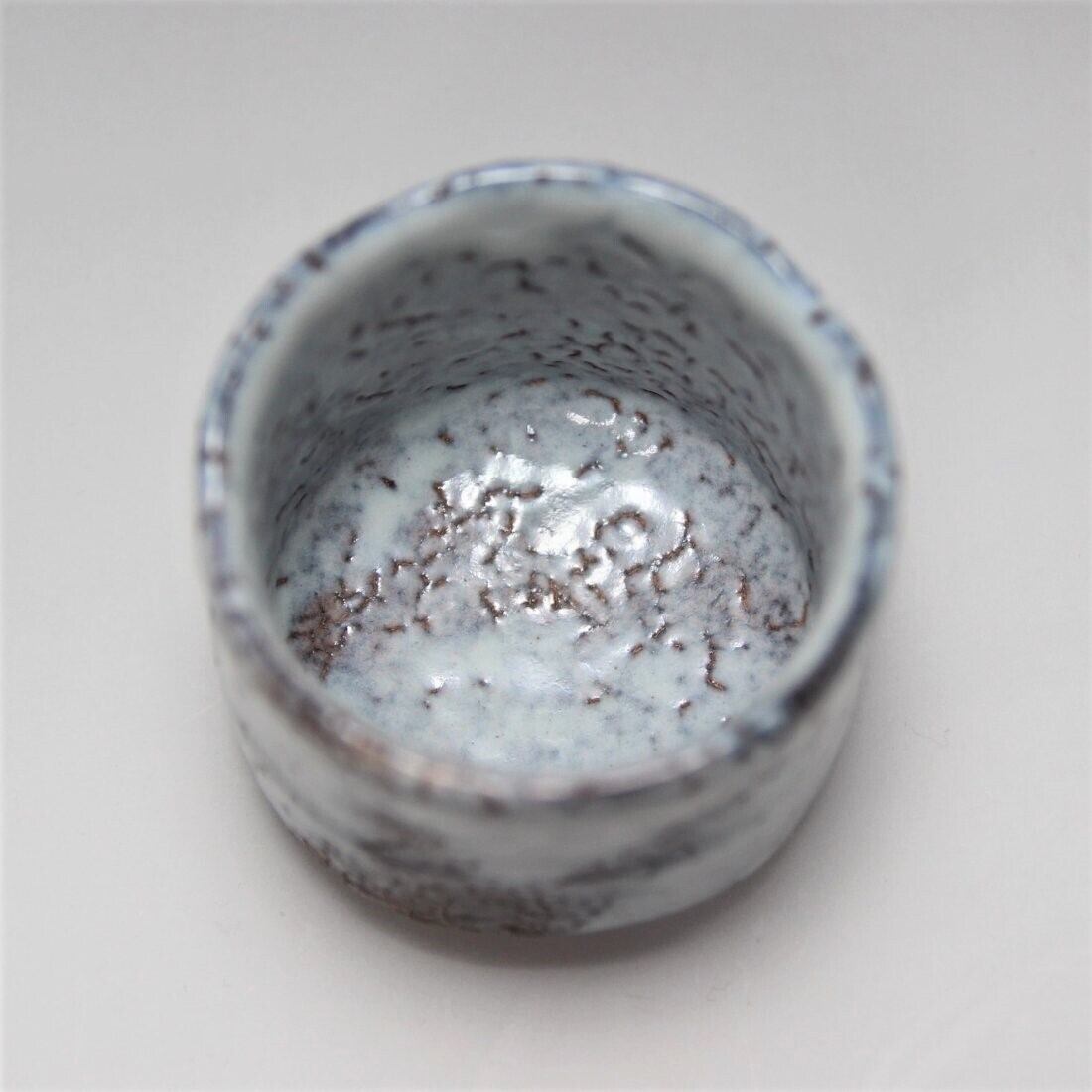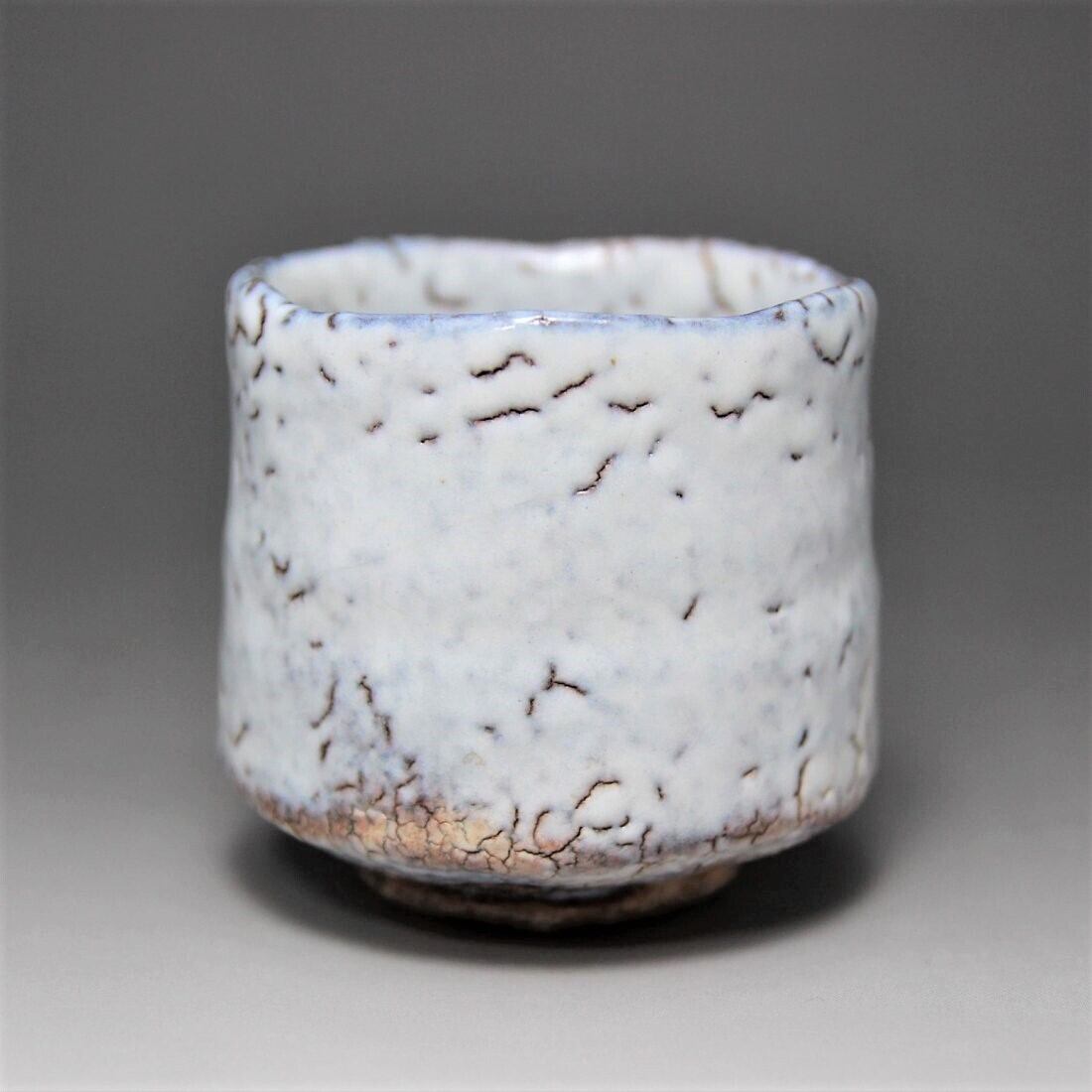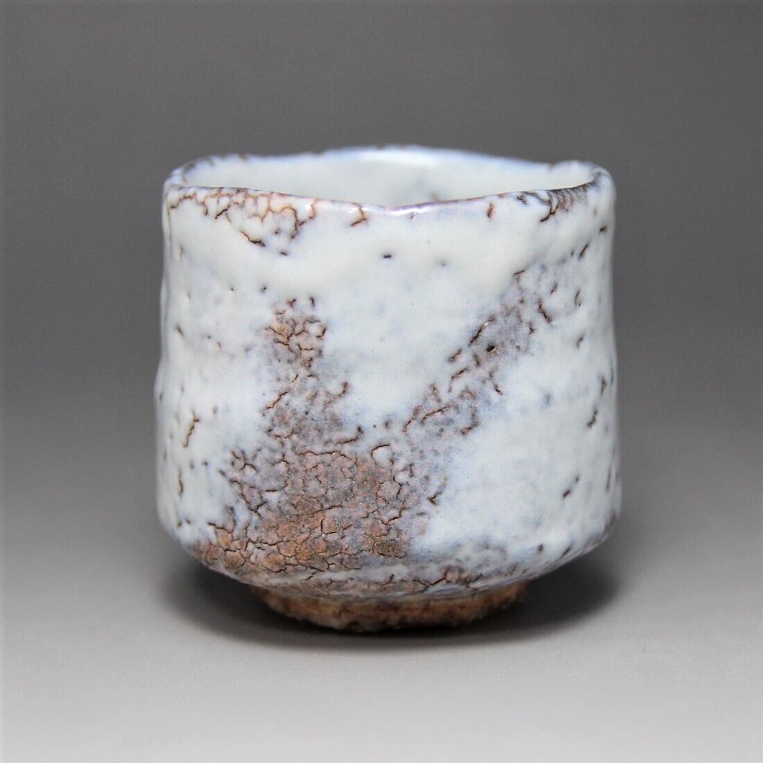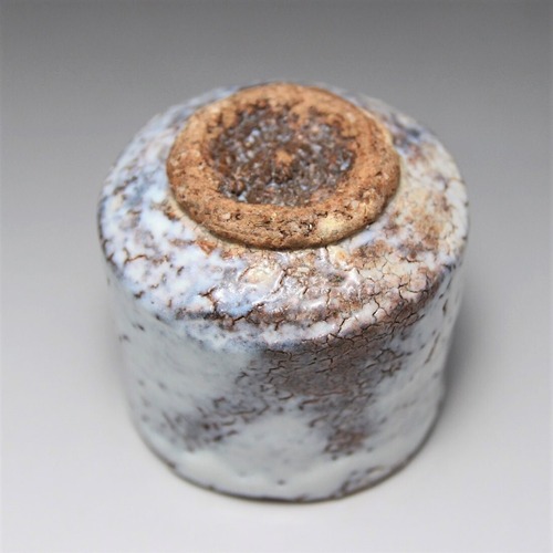 松浦 無元 作 縦7.1cm×横7.1cm×高さ6.7cm 木箱入り 荒い土肌の地割れと白い釉薬のコントラストが目を引くぐい呑です。