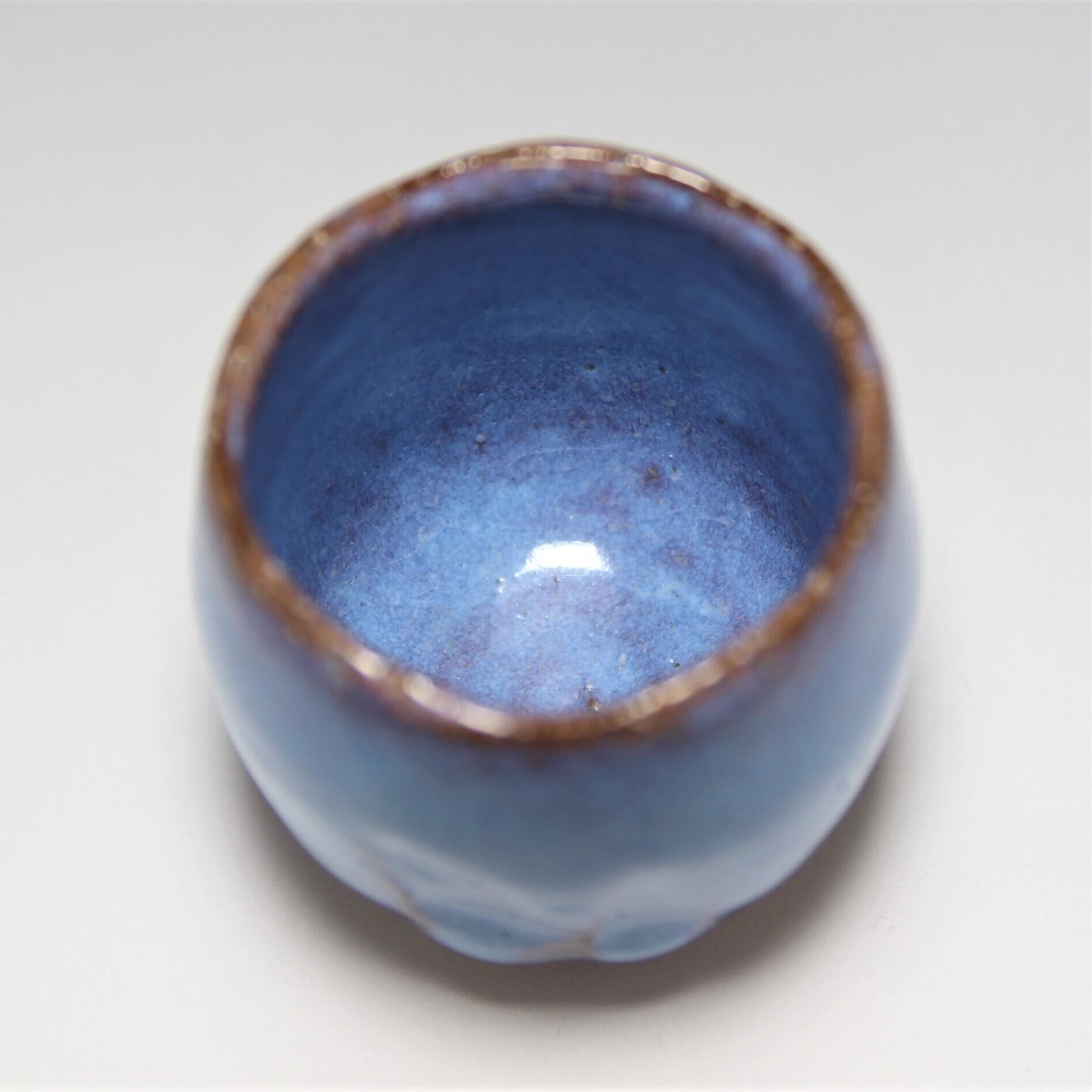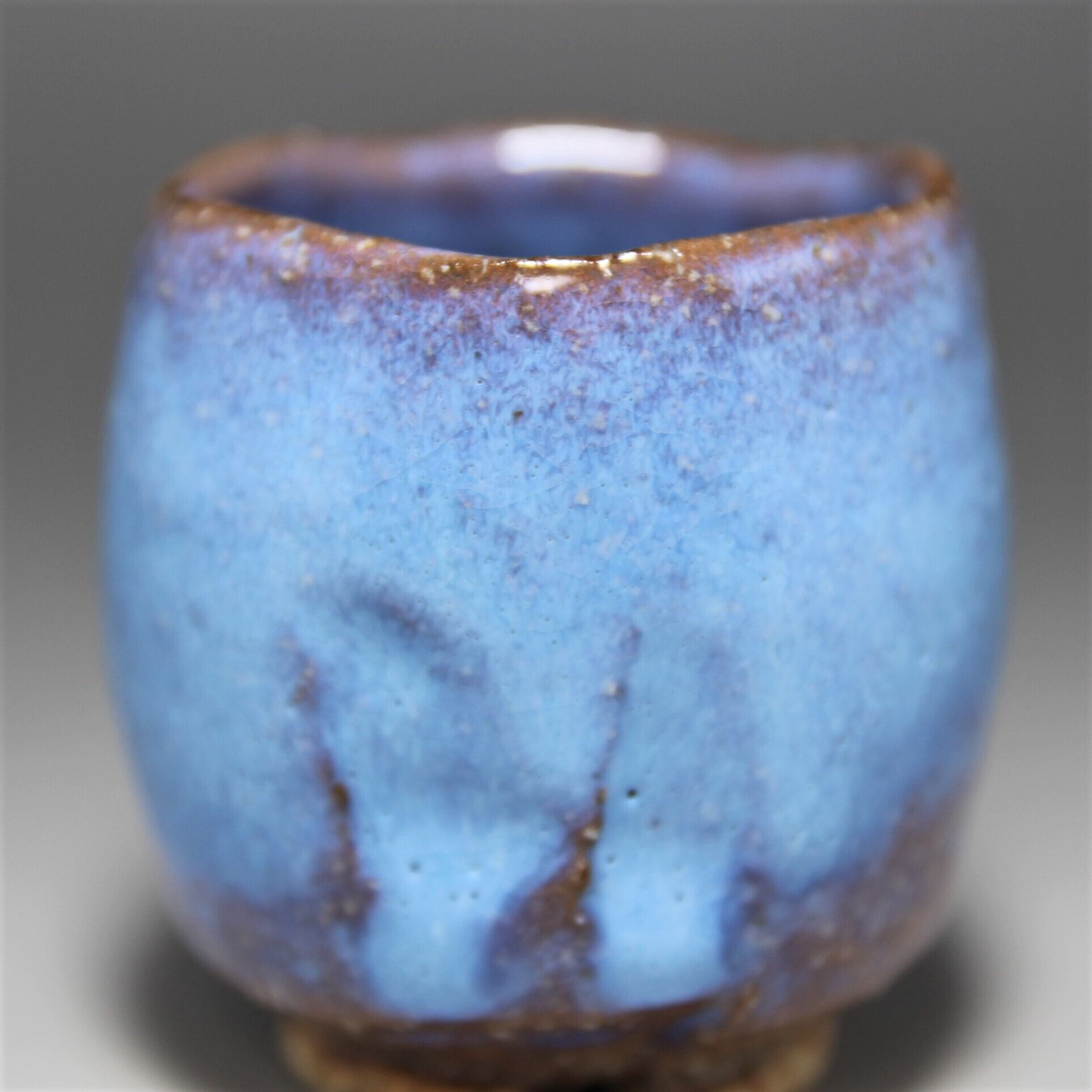 松雲山窯(松浦無元 作) 縦6.3cm×横6.3cm×高さ6.7cm 木箱入り 鮮やかな透明感のある青色の釉薬が掛ったぐい呑です。