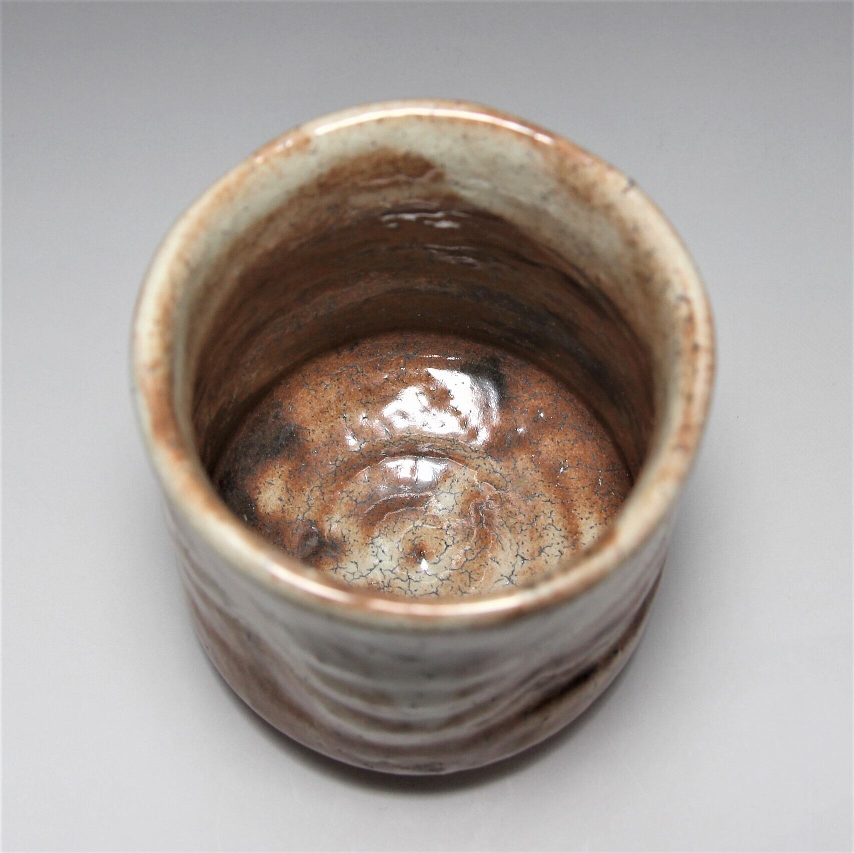 松雲山窯(松浦無元 作) 縦8.8cm×横8.8cm×高さ9.6cm 木箱包装 土台の土と化粧土のムラが全体に変化を与えていて、萩焼らしい渋めの雰囲気を持った湯呑です。