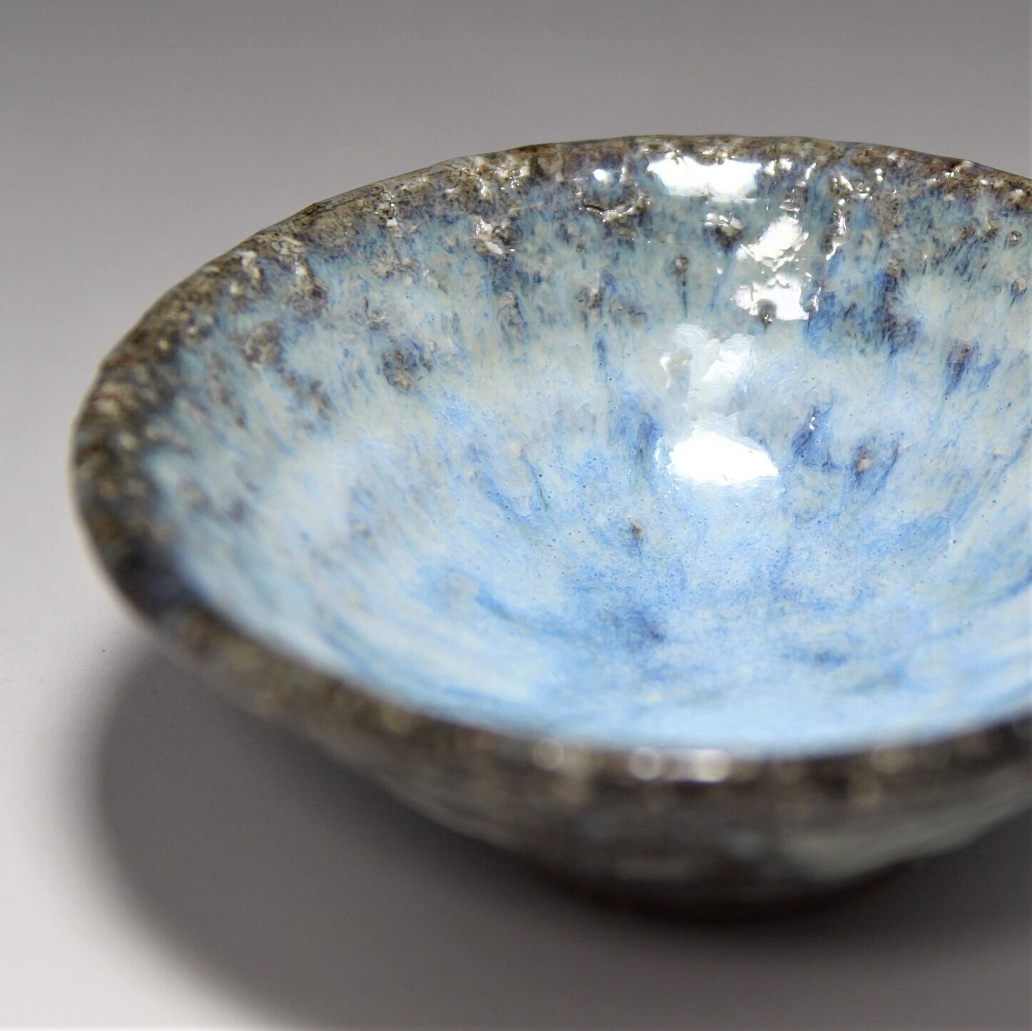 松雲山窯(松浦無元 作) 縦9.2cm×横9.2cm×高さ3.3cm 木箱入り 中心に青色の釉薬が流れて集まったような透明感のある盃です。
