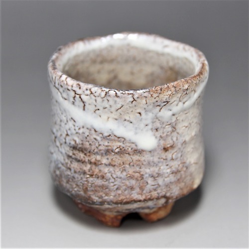 松雲山窯(松浦無元 作) 縦6.7cm×横6.7cm×高さ6.9cm 木箱入り 荒めの地割れに白い釉薬が薄く掛かり、力強い雰囲気のぐい呑です。